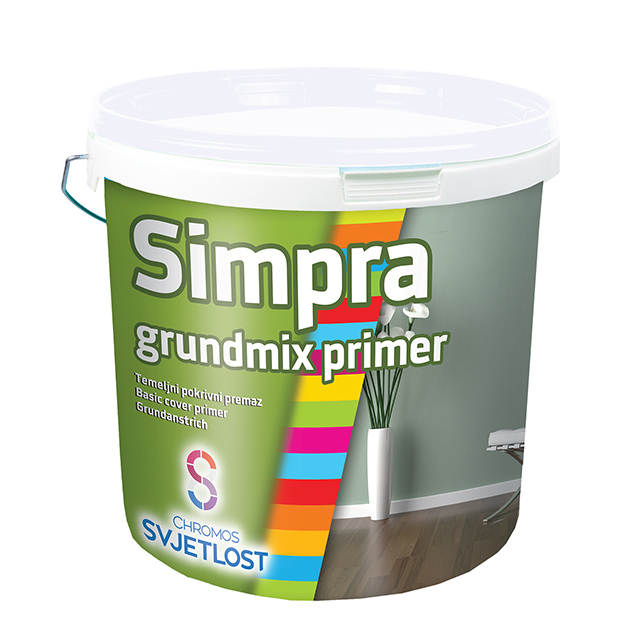 SIMPRA GRUNDMIX PRIMER - pokrivni temeljni premaz za impregniranje površin notranjih zidov. Uporablja se za povečanje pokrivnosti končnega sloja na zamazanih zidovih ali na nehomogenih površinah kot so nove mavčno-kartonske plošče. Prav tako izboljšuje pokrivnost slabo pokrivnih nians končnega premaza. Priporočamo ga tudi za notranje podlage, na katere so nanešene močne nianse in jih želimo prebarvati v drugo nianso. Z uporabo Simpra grundmix primer-a se zmanjša poraba končne nianse. Nanaša se s čopičem ali valjčkom pred končno nianso v enem sloju na čvrsto, čisto in suho podlago.