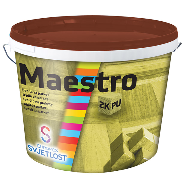MAESTRO 2K PU LEPILO ZA PARKET je dvokomponentno poliuretansko reakcijsko lepilo brez dodatka vode in topil za lepljenje vseh vrst parketa, ploščic iz naravnega kamna, keramičnih ploščic in kovin na vpojne in nevpojne betonske, lesene in druge podlage. Zmes je odporna na vodo in povišano temperaturo.
