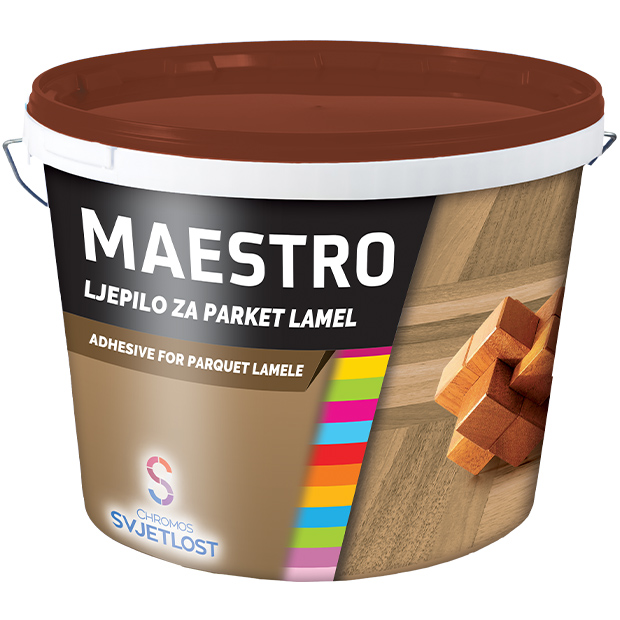 MAESTRO ljepilo za lamel parket je na bazi vodene disperzije polivinilacetata za lijepljenje klasičnog i lamel parketa na betonske, drvene i slične podloge.