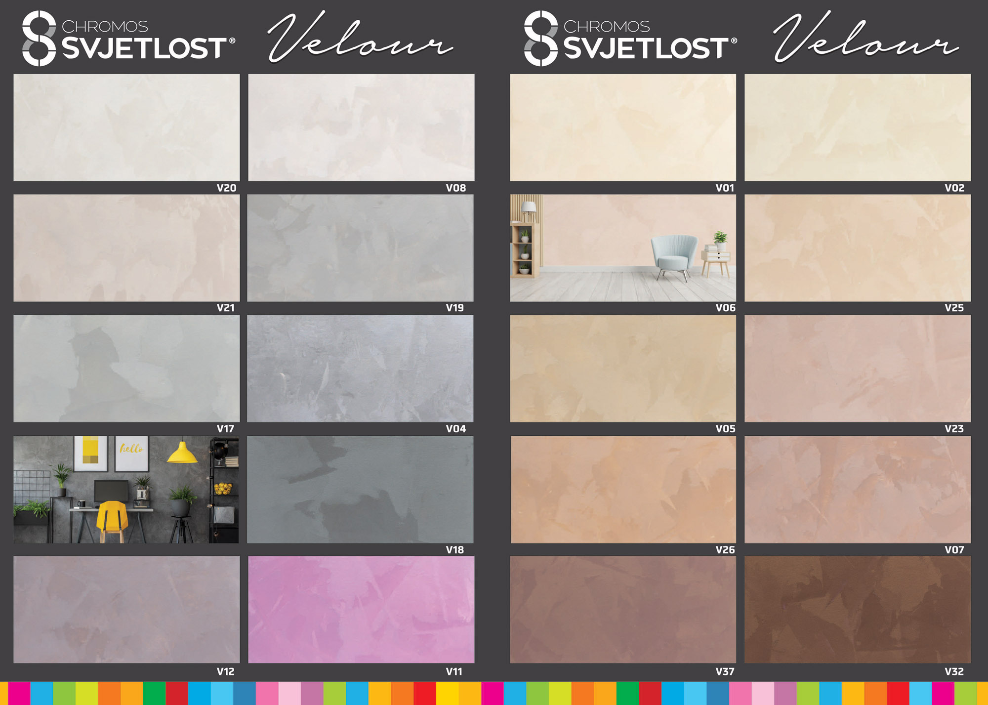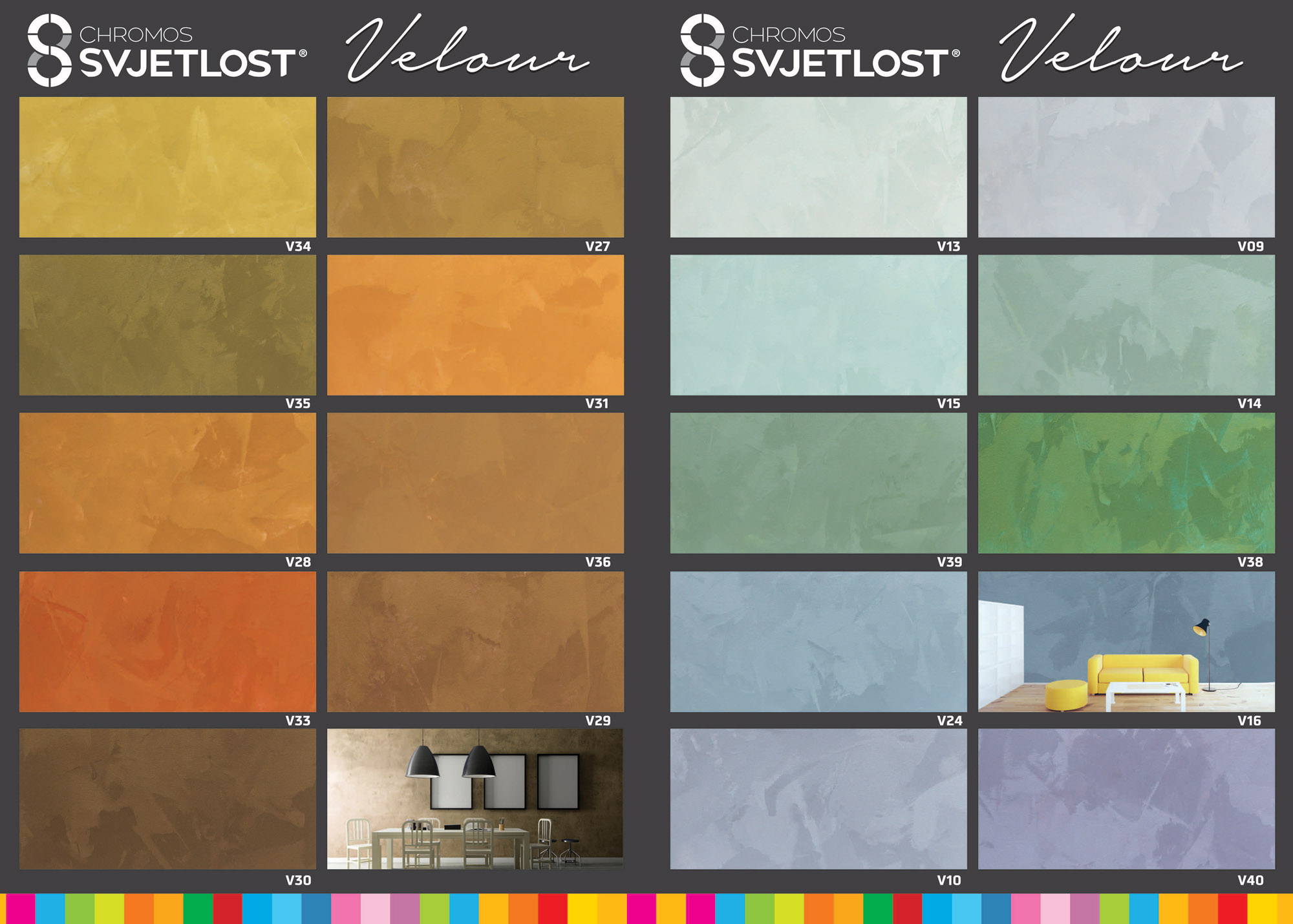 Proizvaja se v srebrnem in zlatem odtenku, z uporabo Top Mix sistema za strojno niansiranje Chromos-Svjetlost pa lahko dobimo široko paleto odtenkov iz nove tonske lestvice BRAVO INSPIRE VELOUR.